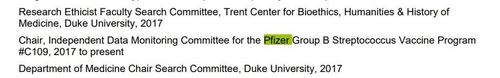 Geeta K. Swamy figure sur la liste des présidents du « Comité indépendant de surveillance des données pour le programme de vaccins Pfizer contre le streptocoque du groupe B », un comité parrainé par Pfizer. L’Université Duke déclare que « le Dr Swamy est co-investigateur de l’essai du vaccin COVID-19 de Pfizer ».