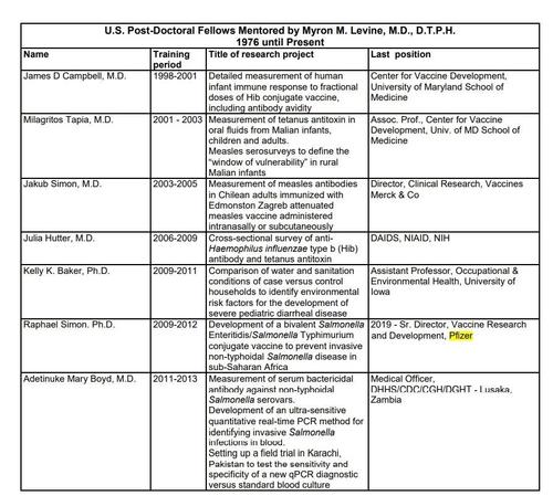 Myron Levine a encadré quelques post-doctorants américains, et l’un de ses protégés se trouve être Raphael Simon, directeur principal de la recherche et du développement des vaccins chez Pfizer.