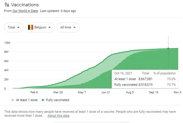 Ils ne l’ont pas mentionné dans leur article, mais le nombre de personnes « complètement vaccinées » dans l’ensemble de la Belgique est supposé être de 73,7 % au 16 octobre, selon Notre monde en chiffres.