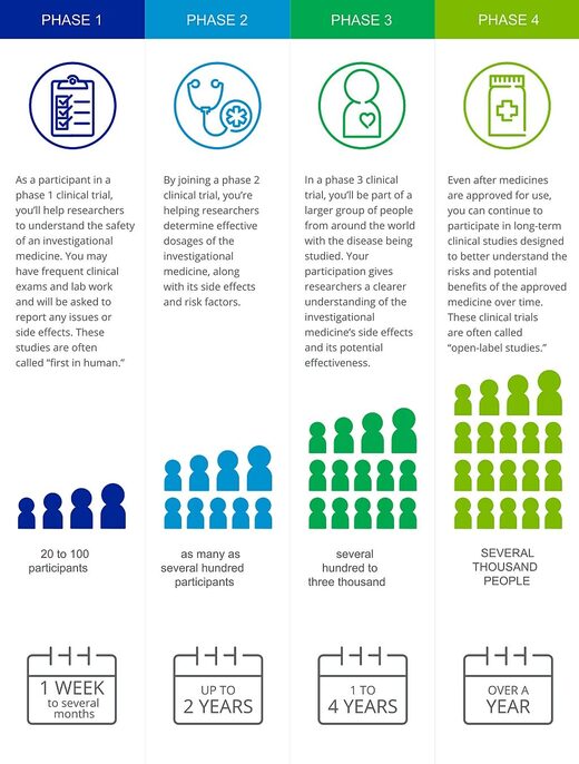 La phase 2 comprend généralement plusieurs centaines de participants et dure jusqu’à deux ans. Dans la phase 3, plusieurs centaines à 3 000 participants sont suivis pendant un à quatre ans. La phase 4 comprend généralement plusieurs milliers d’individus qui sont suivis pendant au moins un an ou plus. Après chaque phase, les données sont examinées pour évaluer l’efficacité et les effets indésirables.