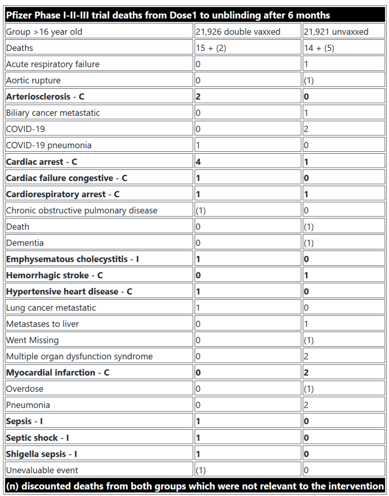 Drapeau blanc a découvert des résultats extrêmement inquiétants dans les données des essais cliniques de phase I-II-III de Pfizer. Le taux de mortalité par septicémie dans les 21 926 groupes doublement vaccinés de l’essai clinique de phase III de Pfizer était vingt-et-une fois supérieur à la normale, et le taux de mortalité cardiovasculaire était deux fois supérieur à la normale.