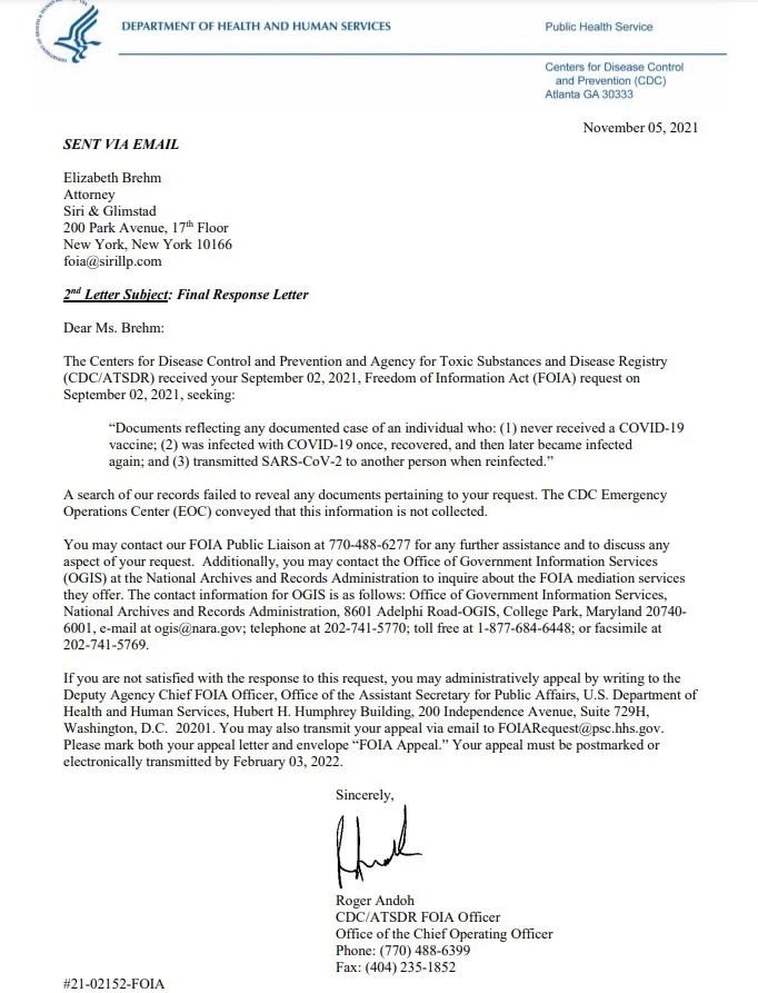 Comme preuve finale que les vaccins Covid détruisent le système immunitaire, nous avons maintenant l’admission par le CDC en réponse à une demande de liberté d’information, qu’ils n’ont aucune trace d’une personne avec une immunité naturelle devenant réinfectée et transmettant le virus à quiconque.