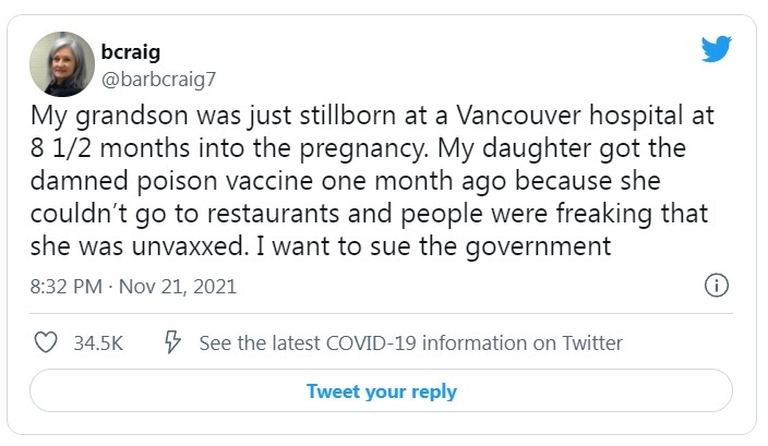 Le 21 novembre 2021, une femme a publié sur les médias sociaux que sa fille, enceinte de 8 mois et demi et ayant reçu une injection de COVID-19 il y a un mois, a eu un petit-fils mort-né dans un hôpital de Vancouver.