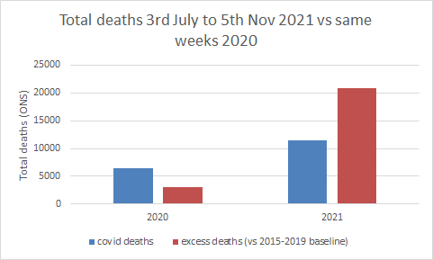 Le nombre de décès chez des particuliers est également supérieur de 40,9 % à la moyenne sur cinq ans, avec 964 décès excédentaires enregistrés au cours de la semaine la plus récente, qui s’achève le 5 novembre. » (« Alarm grows as mortuaries fill with thousands of extra non-Covid deaths », UK Telegraph)