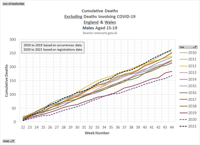 « Si vous commencez à la semaine 22 et que vous additionnez tous les décès depuis pour chaque année, alors quelque chose de très anormal se produit cette année chez les hommes de 15 à 19 ans. »