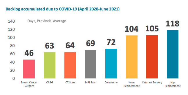 Pour estimer le temps d’attente total, nous pouvons ajouter les chiffres de l’arriéré aux chiffres pré-pandémie du rapport Waiting Your Turn 2019 de l’Institut Fraser. Le rapport indique que le temps d’attente médian national pour les remplacements du genou et de la hanche en 2019 était de 28,6 semaines (200 jours), et que l’attente médiane était de 18 semaines (126 jours) pour les chirurgies de la cataracte. Si l’on ajoute ces chiffres à ceux de l’arriéré ci-dessus, on peut estimer le temps d’attente total actuel à 304 jours pour les remplacements de genou, 318 jours pour les remplacements de hanche et 231 jours pour les opérations de la cataracte. Pour résumer, ce n’est pas le meilleur moment pour être sur le marché des procédures médicales.