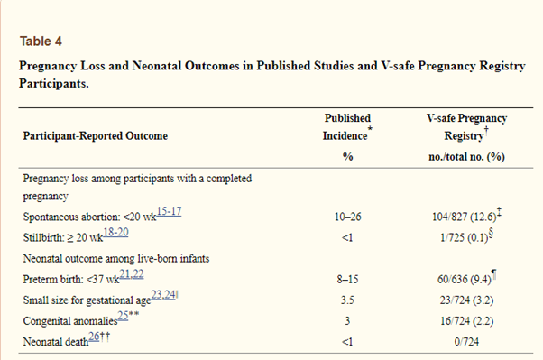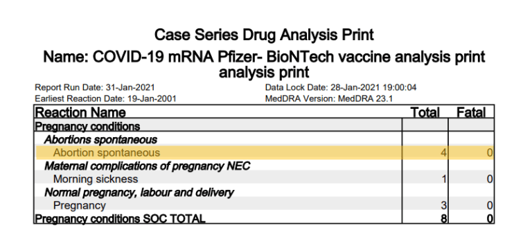 Cependant, notre analyse a prouvé que ces chiffres étaient extrêmement trompeurs, car sur les 827 grossesses menées à terme, 700 / 86% des femmes avaient reçu une dose du vaccin Pfizer ou Moderna Covid-19 au cours du troisième trimestre de la grossesse, ce qui signifie qu’il leur était impossible de faire une fausse couche, car celle-ci ne peut survenir qu’avant la 20e semaine de grossesse.