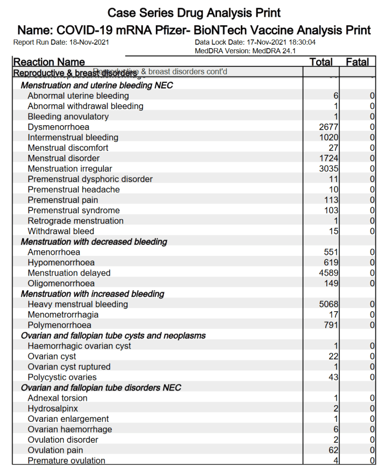Jusqu’au 17 novembre 2021, la MHRA a reçu 1 724 rapports de troubles menstruels, 3 034 rapports d’irrégularités menstruelles, 5 068 rapports de saignements menstruels abondants, parmi des milliers d’autres, comme effets indésirables présumés du vaccin Covid-19 de Pfizer.