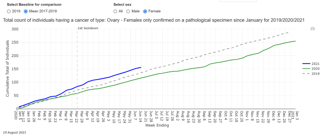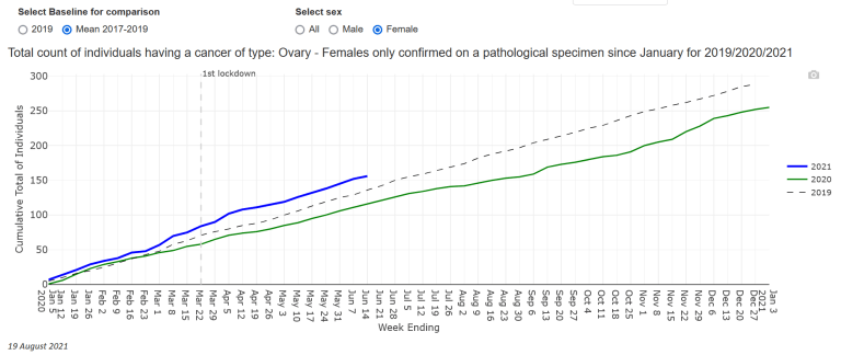 Toutefois, les données relatives au nombre d’individus souffrant d’un cancer de l’ovaire montrent que la tendance actuelle en 2021 est nettement supérieure à celle de 2020 et à la moyenne 2017-2019.
