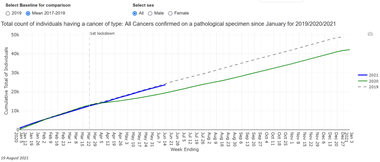 Les données disponibles pour tous les types de cancers montrent que le nombre total d’individus souffrant d’un cancer en 2021 est légèrement inférieur à la moyenne 2017-2019, mais supérieur aux chiffres enregistrés en 2020.