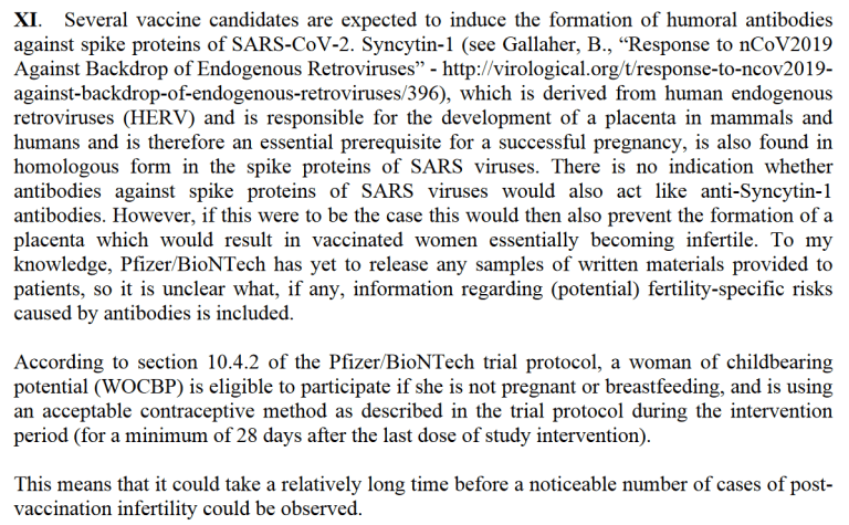 En décembre 2020, le Dr Wolfgang Wodarg, médecin et épidémiologiste qui a été membre du Bundestag (Parlement fédéral allemand) de 1994 à 2009, et le Dr Mike Yeadon, ancien vice-président de Pfizer, où il a passé 16 ans en tant que chercheur dans le domaine des allergies et des maladies respiratoires, ont écrit à l’Agence européenne des médicaments pour demander la suspension immédiate de toutes les études sur le vaccin contre le SRAS-CoV2 en raison de preuves suggérant que les candidats au vaccin Covid-19 pourraient déclencher une réaction immunitaire contre une protéine humaine responsable de la formation du placenta.
