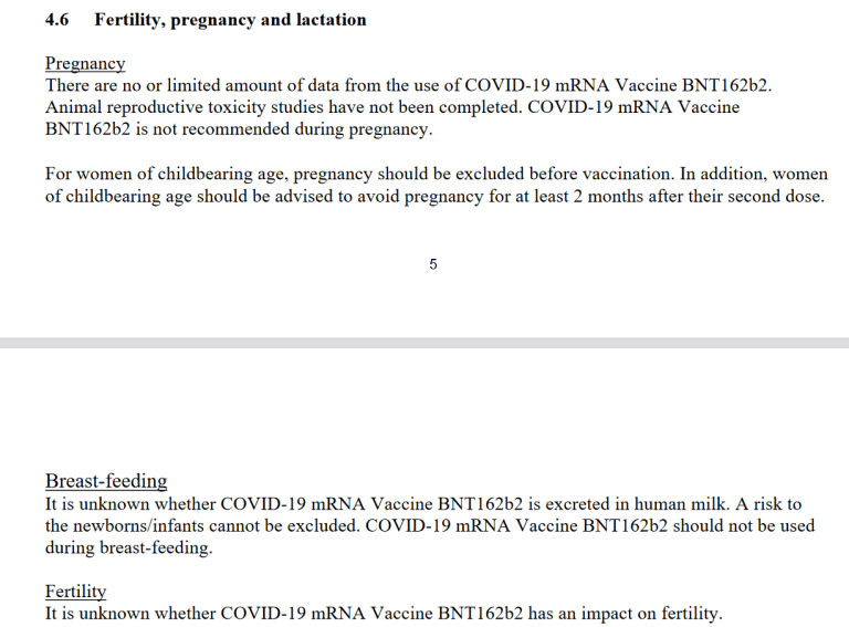 Le gouvernement britannique a clairement indiqué dans le document officiel « REG 174 INFORMATION FOR UK HEALTHCARE PROFESSIONALS » préparé lors de l’autorisation d’urgence de l’injection Pfizer mRNA Covid-19 que l’utilisation du vaccin Pfizer n’était pas recommandée pendant la grossesse, que la grossesse devait être exclue avant la vaccination et que les femmes en âge de procréer devaient éviter toute grossesse pendant au moins 2 mois après la deuxième dose.
