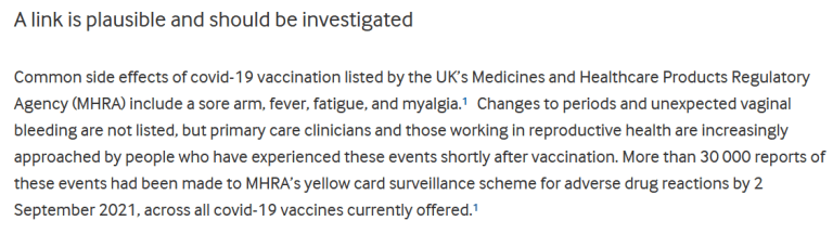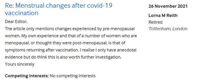 En septembre 2021, le Dr Victoria Male, maître de conférences en immunologie reproductive à l’Imperial College de Londres, a publié un article dans le British Medical Journal dans lequel elle affirme qu’un lien entre les changements menstruels et la vaccination Covid-19 est parfaitement plausible et devrait être étudié.