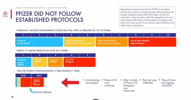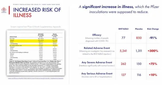Le groupe d’experts de la CCCA a procédé à une analyse approfondie du rapport de Pfizer sur les essais de vaccins du 31 décembre 2020. Le rapport de Pfizer affirme que les inoculations étaient sûres et présentaient une efficacité robuste de 95 % 7 jours après la 2e dose. Mais ce que les chercheurs ont omis de mentionner, c’est que les 95 % correspondaient en fait à une réduction du risque relatif. La réduction du risque absolu, qui aurait dû être prise en compte – surtout si ce vaccin devait être rendu obligatoire pour tous – était inférieure à 1 %.
