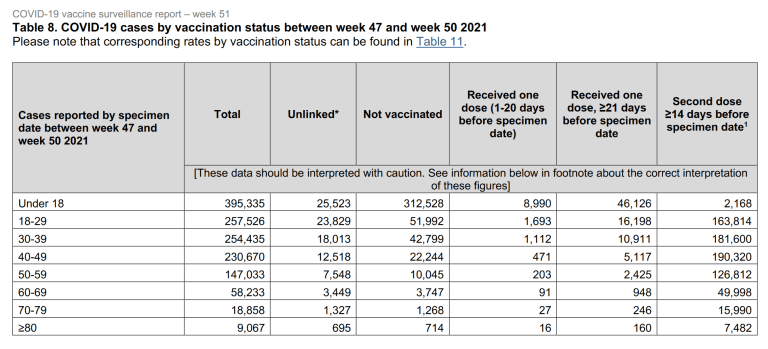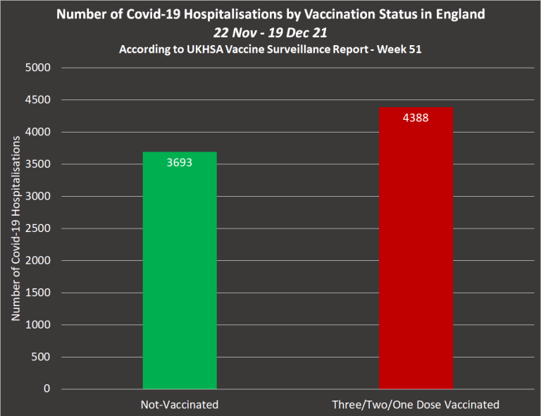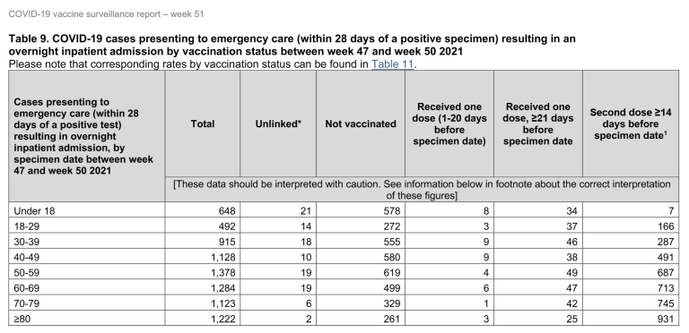 Le nombre total d’hospitalisations par statut vaccinal pour tous les groupes d’âge entre le 22 novembre et le 19 décembre 2021, tel que confirmé par le tableau 9 du rapport de l’UKHSA, est le suivant : – 1.