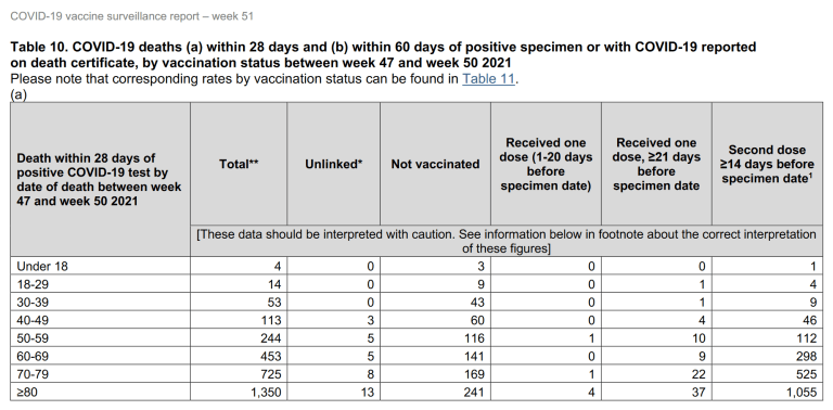 Le nombre total de décès présumés de Covid-19 par statut vaccinal entre le 22 novembre et le 19 décembre, tel que confirmé par le tableau 10 du rapport de l’UKHSA, est le suivant –