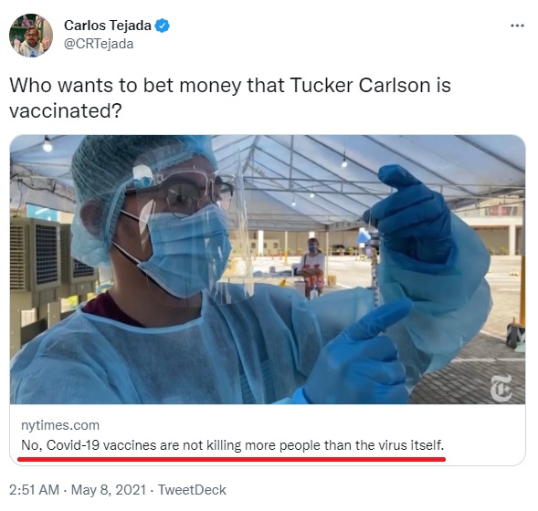 Ironie du sort, en mai, Tejada a publié sur Twitter un article réfutant l’affirmation selon laquelle le vaccin avait tué des gens.