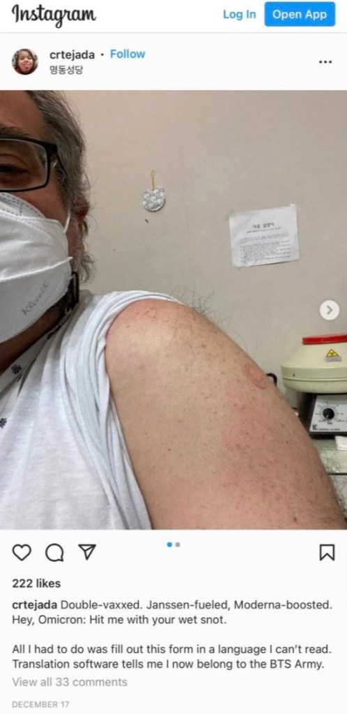« Double-vaxxé. Alimenté par Janssen, boosté par Moderna. Hey, Omicron : frappe-moi avec ta morve humide », a plaisanté Tejada. « Tout ce que j’ai eu à faire, c’est remplir ce formulaire dans une langue que je ne sais pas lire. »