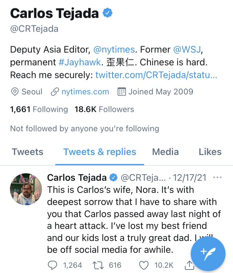 L’épouse de Carlos, Nora Tejada, s’est rendue sur le compte Twitter de son mari le lendemain pour annoncer que son mari était décédé d’une crise cardiaque. La capture d’écran ci-dessous a été réalisée avant que le compte ne soit verrouillé.
