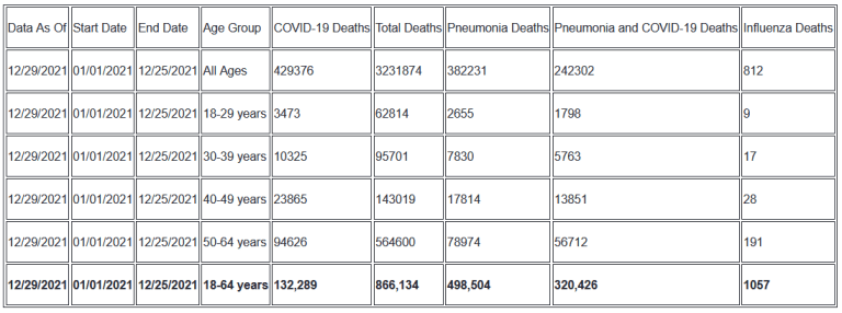 Et les CDC affirment que l’augmentation de 75 405 décès par rapport au chiffre de 2019 (426 507 – 351 102) est inférieure au nombre de décès dus à la maladie de Covid-19 (81 258), ce qui signifie qu’il n’y a pas de place pour les décès dus aux effets secondaires des vaccins. Oui les amis, les vaccins n’ont tué absolument personne. Pas même une seule personne. Parce que tous les décès en excès, et même plus, ont été causés par le Covid-19 selon le CDC.