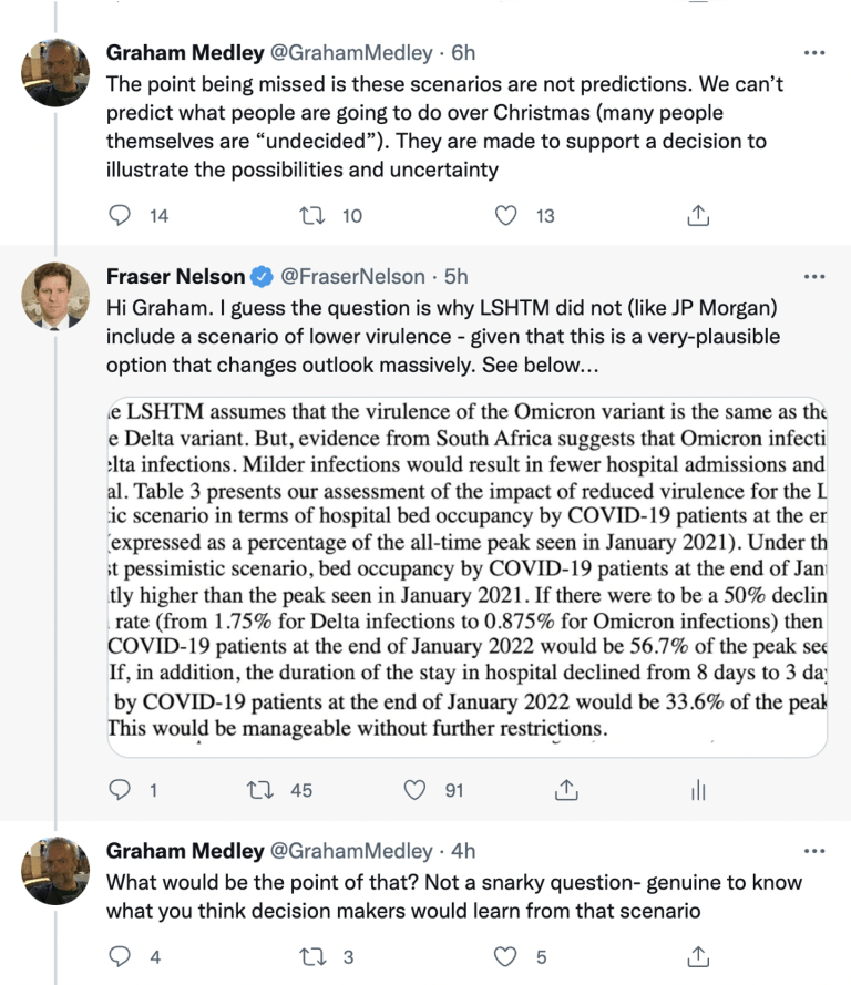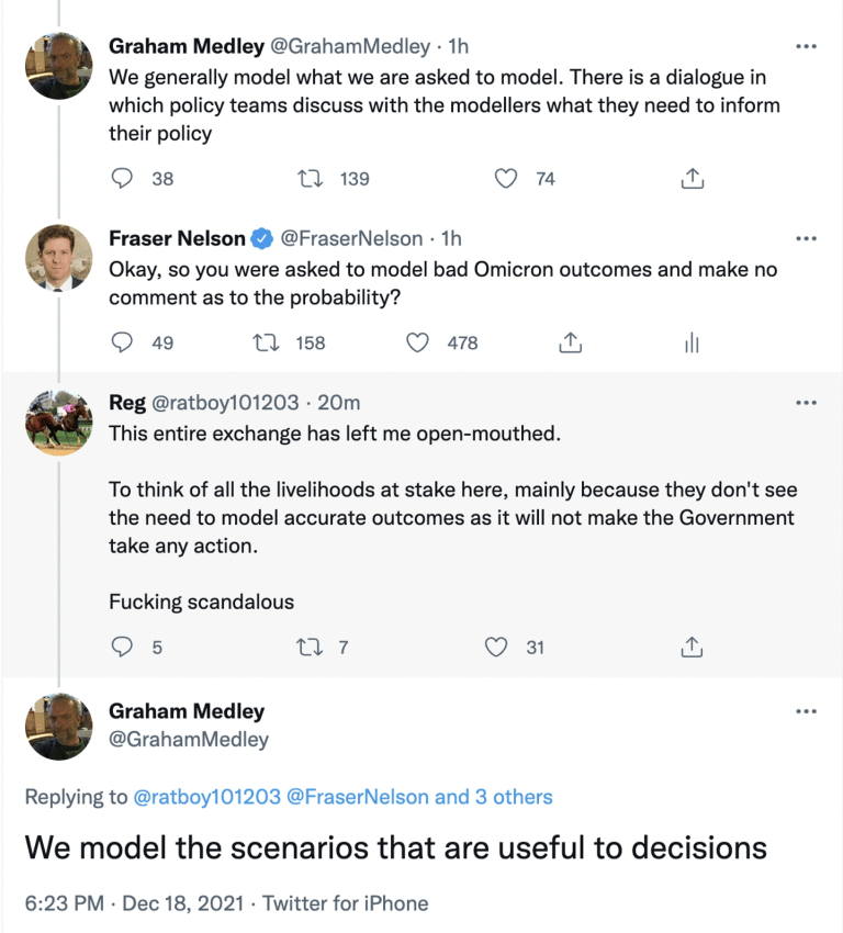 Au Royaume-Uni, la situation est encore plus claire, grâce au brillant journalisme de Fraser Nelson, rédacteur en chef du Spectator. Dans une conversation sur Twitter avec le professeur Graham Medley, de la London School of Hygiene and Tropical Medicine, qui préside le comité de modélisation de SAGE, Fraser a réussi à lui faire admettre que SAGE publie délibérément les scénarios les plus sombres et ignore les moins alarmistes, malgré le fait que les moins alarmistes se sont toujours avérés plus précis. Il demande ensuite au professeur Medley d’expliquer pourquoi : Il admet qu’il modélise ce qui sera utile à ses maîtres payeurs. Il modélise ce qu’on lui demande de modéliser. Ainsi, comme le dit Fraser Nelson lui-même, le gouvernement agit « non pas en fonction d’une politique fondée sur des preuves, mais d’une politique fondée sur des preuves ». Voici la conversation révélatrice qu’ils ont eue…