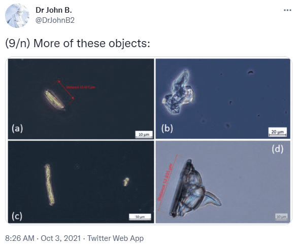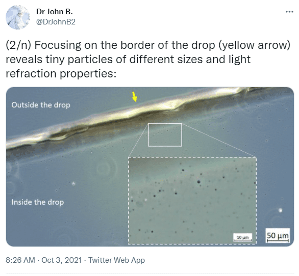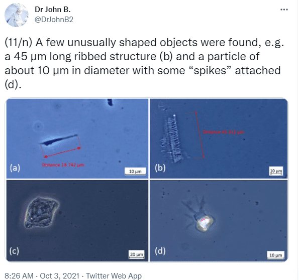 En outre, un fil de discussion Twitter datant d’octobre expose également des particules, des « agrégats de particules » et des « structures de type fibre » – certaines avec des « branches » et une « structure en anneau ». Les conclusions étaient basées sur une « analyse microscopique » de l’échantillon du vaccin à coronavirus Pfizer-BioNTech. Selon le scientifique anonyme, qui affirme avoir été publié plus de 100 fois dans des revues telles que Lancet et le New England Journal of Medicine, l’analyse « a été réalisée à l’aide d’un microscope à champ clair et à contraste de phase et en appliquant des normes scientifiques et hygiéniques rigoureuses. »