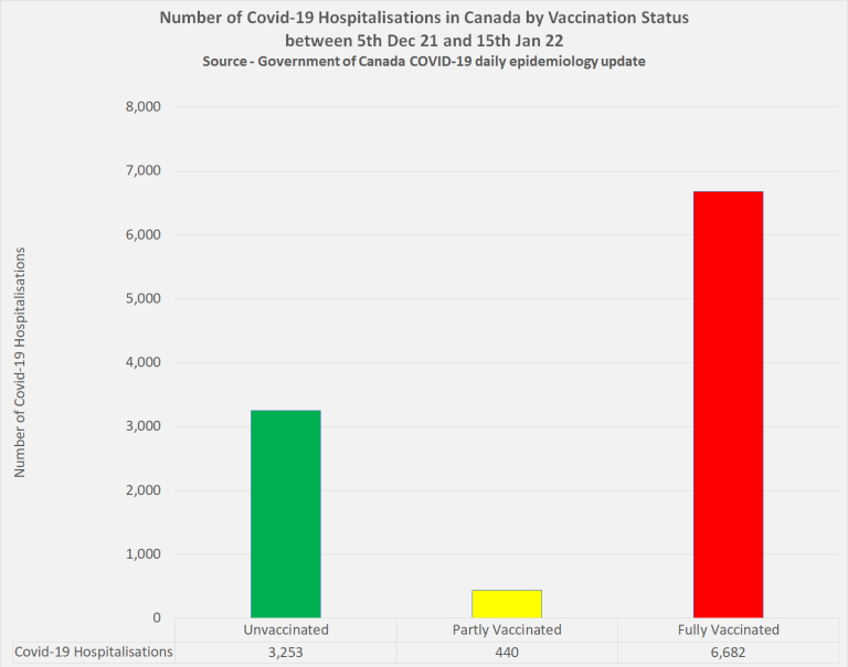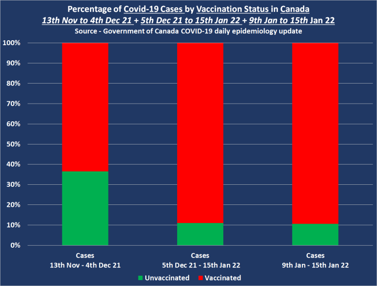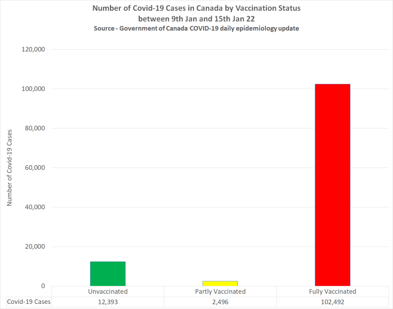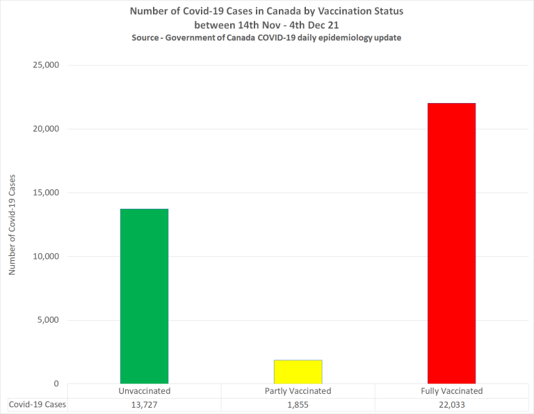 Par conséquent, 36 % de la population n’est pas vaccinée, 5 % de la population est partiellement vaccinée et 59 % de la population est totalement vaccinée. Pourtant, les données les plus récentes du gouvernement du Canada sur le Covid-19 montrent que 89 % des cas sont survenus dans la population vaccinée, dont 98 % étaient entièrement vaccinés.