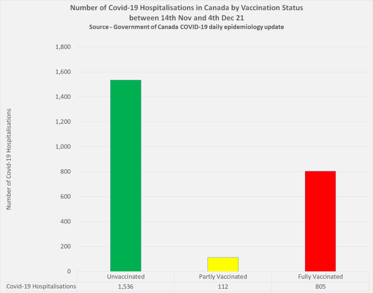 Le graphique suivant montre le nombre d’hospitalisations dues au Covid-19 dans l’ensemble du Canada, par statut vaccinal, entre le 14 novembre et le 4 décembre 21.