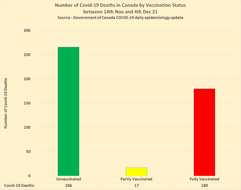 Le graphique suivant montre le nombre de décès dus au Covid-19 dans l’ensemble du Canada, par statut vaccinal, entre le 14 novembre et le 4 décembre 21.