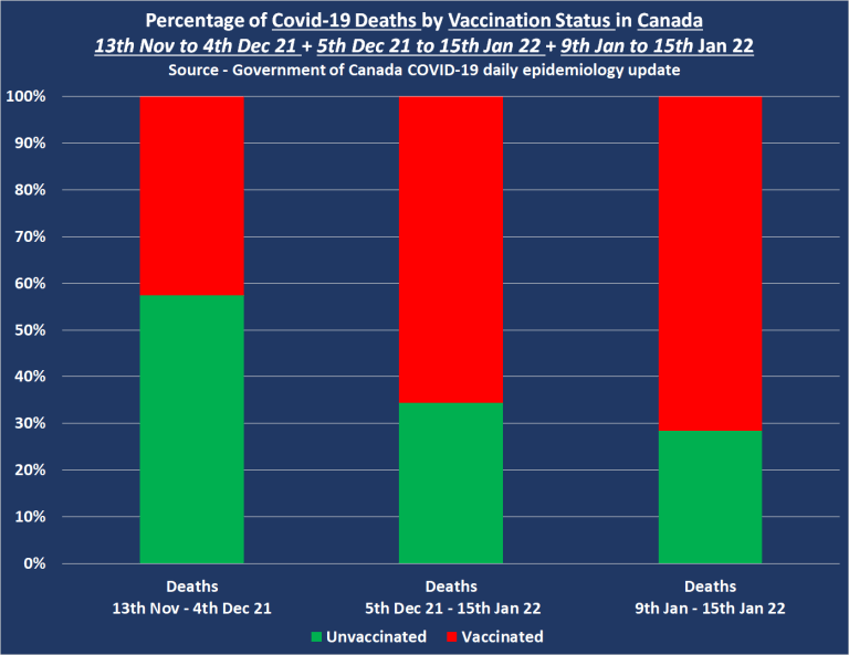 Avancez d’un mois et nous constatons qu’entre le 5 décembre et le 15 janvier 22, les personnes entièrement vaccinées représentaient 64 % des décès dus au Covid-19, tandis que les personnes non vaccinées ne représentaient que 36 %.
