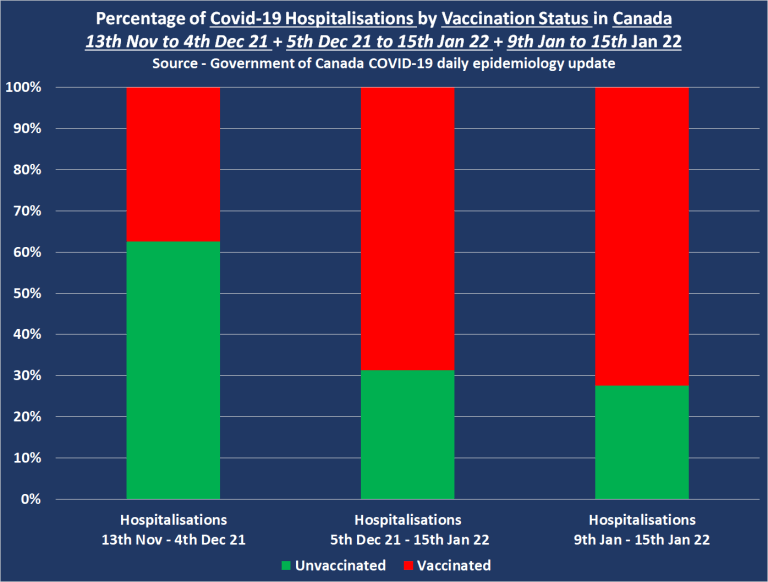 Le graphique suivant montre le pourcentage d’hospitalisations dues au virus Covid-19 par statut vaccinal au Canada du 13 novembre au 4 décembre 21, du 5 décembre 21 au 15 janvier 22 et du 9 janvier au 15 janvier 22.