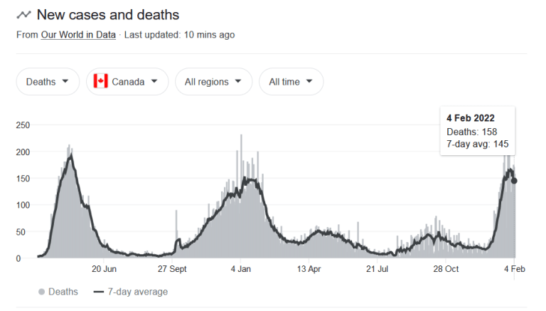 Le graphique suivant montre le nombre de décès dus au Covid-19 au Canada de mars 2020 à février 2022. Comme vous pouvez le constater, il y a eu un énorme pic de décès dus au Covid-19 autour de janvier 2021.