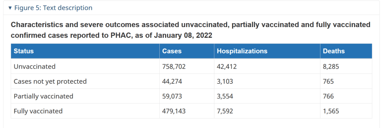 Mais nous pouvons vous assurer que cela n’a rien à voir avec le pourcentage de la population qui a été entièrement vaccinée. Selon le dernier rapport du gouvernement du Canada, au 15 janvier 22, 22,6 millions de personnes étaient considérées comme totalement vaccinées, tandis que 24,3 millions de personnes avaient reçu au moins une dose.