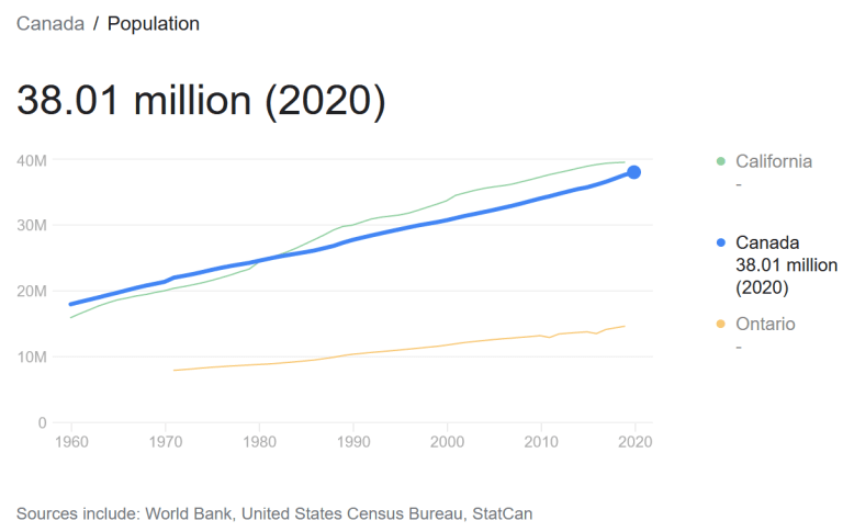 La population du Canada en 2020 a été officiellement estimée à 38,01 millions d’habitants.