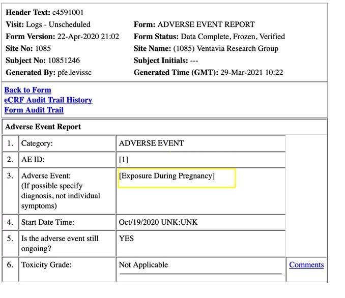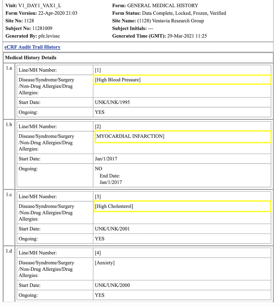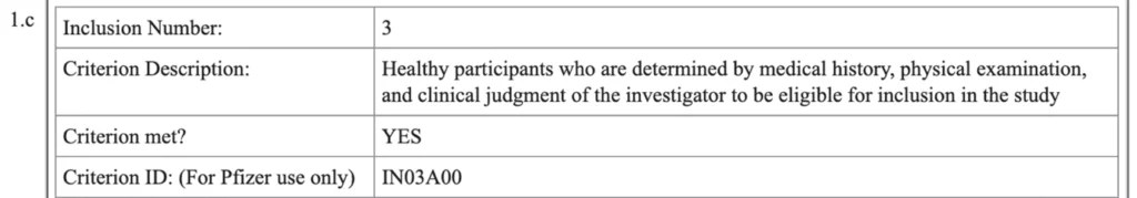 Le sujet n° 11281009 faisait partie des essais de phase 2/3 de Pfizer dans la population saine. Cette cohorte a été jugée éligible par le jugement clinique de l’investigateur en répondant aux critères de « santé ».