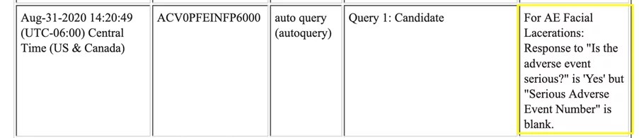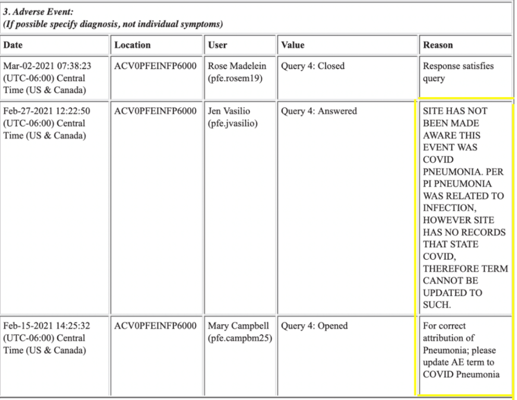 Un autre enquêteur ouvre la même requête, déclarant que le terme AE de pneumonie devrait être mis à jour en Pneumonie Covid. La réponse est intéressante car elle indique simplement que « le site n’a pas été informé qu’il s’agissait d’une pneumonie Covid. Selon le PI (principal investigateur), la pneumonie est liée à une infection, le terme ne peut donc pas être mis à jour en tant que tel ». Cette réponse semble satisfaire la demande et elle est close. Aucune autre question n’a été posée ; aucune enquête ne semble avoir été effectuée. (Voir la capture d’écran ci-dessous)