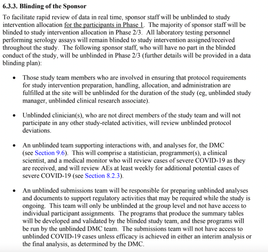 Dans la phase 2/3, l’équipe non aveugle soutenant le DMC, y compris un moniteur médical non aveugle, examinera les cas de COVID-19 sévère au fur et à mesure qu’ils seront reçus et examinera les EI au moins une fois par semaine pour détecter d’autres cas potentiels de COVID-19 sévère. A tout moment, l’équipe non aveugle peut discuter avec le président du CGD pour savoir si le CGD doit examiner les cas de déséquilibre défavorable des cas de COVID-19 et/ou de COVID-19 sévère entre le groupe vacciné et le groupe placebo ».