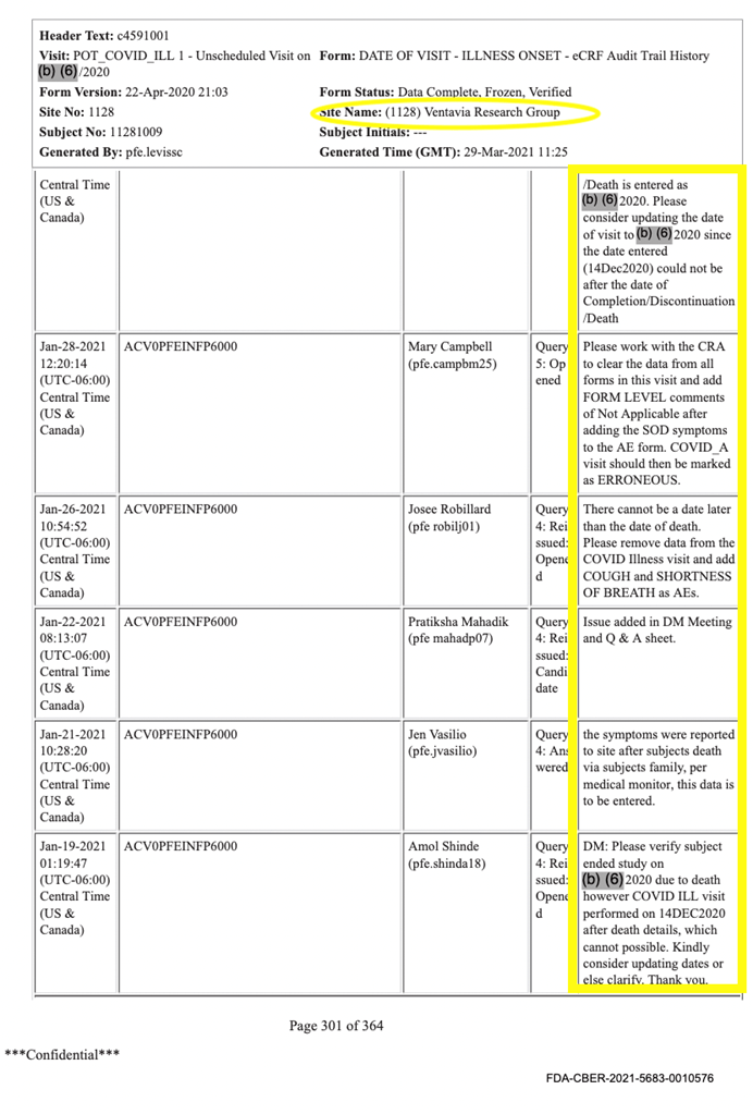 Il est difficile de comprendre comment un investigateur de Ventavia a pu considérer ce participant comme sain et l’inclure dans l’essai. J’ai rencontré d’autres participants qui ont été inclus dans ces phases d’essais (sur la population en bonne santé) et dont les antécédents médicaux généraux comportaient une longue liste d’affections. Quelle pression le promoteur (Pfizer) a-t-il exercée sur l’organisme de recherche sous contrat et les sites d’essai participants pour le recrutement des participants à l’essai du vaccin ?
