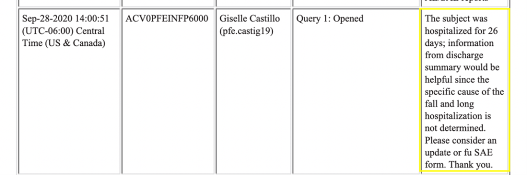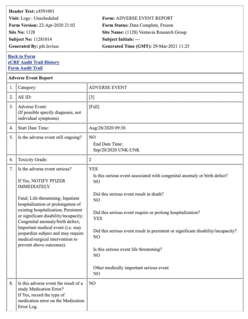Ce qui est inhabituel dans les CRF de ce sujet, c’est qu’ils révèlent que ce participant a fait une chute grave, le lendemain, le 28 août, après l’administration de la deuxième dose, ce qui a entraîné son hospitalisation. (Voir la capture d’écran ci-dessous)