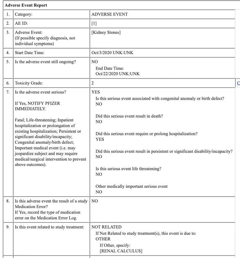Étant donné que ce participant n’avait pas d’antécédents d’insuffisance rénale avant de prendre part à l’essai et que des calculs rénaux et une insuffisance rénale ont été signalés comme des effets secondaires du vaccin Pfizer-BioNTech, on peut se demander pourquoi ces EI n’ont pas fait l’objet d’un examen plus approfondi pour déterminer s’ils étaient liés au traitement de l’étude, en particulier lorsqu’ils sont apparus un mois seulement après la deuxième dose de traitement.