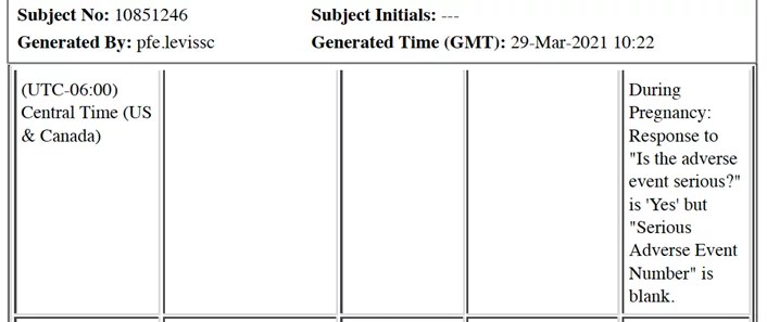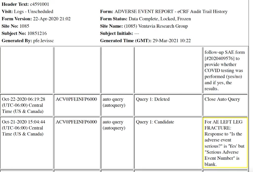 Pour ces deux EIG, le personnel de Ventavia a déclaré que les deux événements étaient dus à « d’autres raisons » et n’étaient pas liés au traitement de l’étude. Cependant, on peut douter de la crédibilité de cette information étant donné que la chute et les lacérations faciales étaient intrinsèquement liées. Ainsi, si les lacérations faciales étaient dues à une « hypotension », la chute devait également être due à cette raison.
