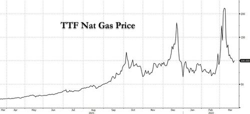 Les contrats à terme sur le gaz liés au TTF, le prix de gros du gaz en Europe ont oscillé d’environ 70 € le mégawattheure avant l’invasion de l’Ukraine par la Russie à environ 230 € il y a deux semaines, puis ont glissé sous les 100 € cette semaine. Avant mai 2021, le prix du gaz en Europe était inférieur à 20 euros par mégawattheure.