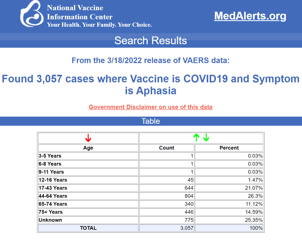 Je voulais m’assurer que tout le monde sache que l’aphasie est l’un des milliers de symptômes dont le taux de déclaration a été élevé après le lancement des vaccins COVID. Il s’agit du 1574ème symptôme sur la liste des symptômes élevés par le vaccin COVID que nous avons calculée en novembre 2021.